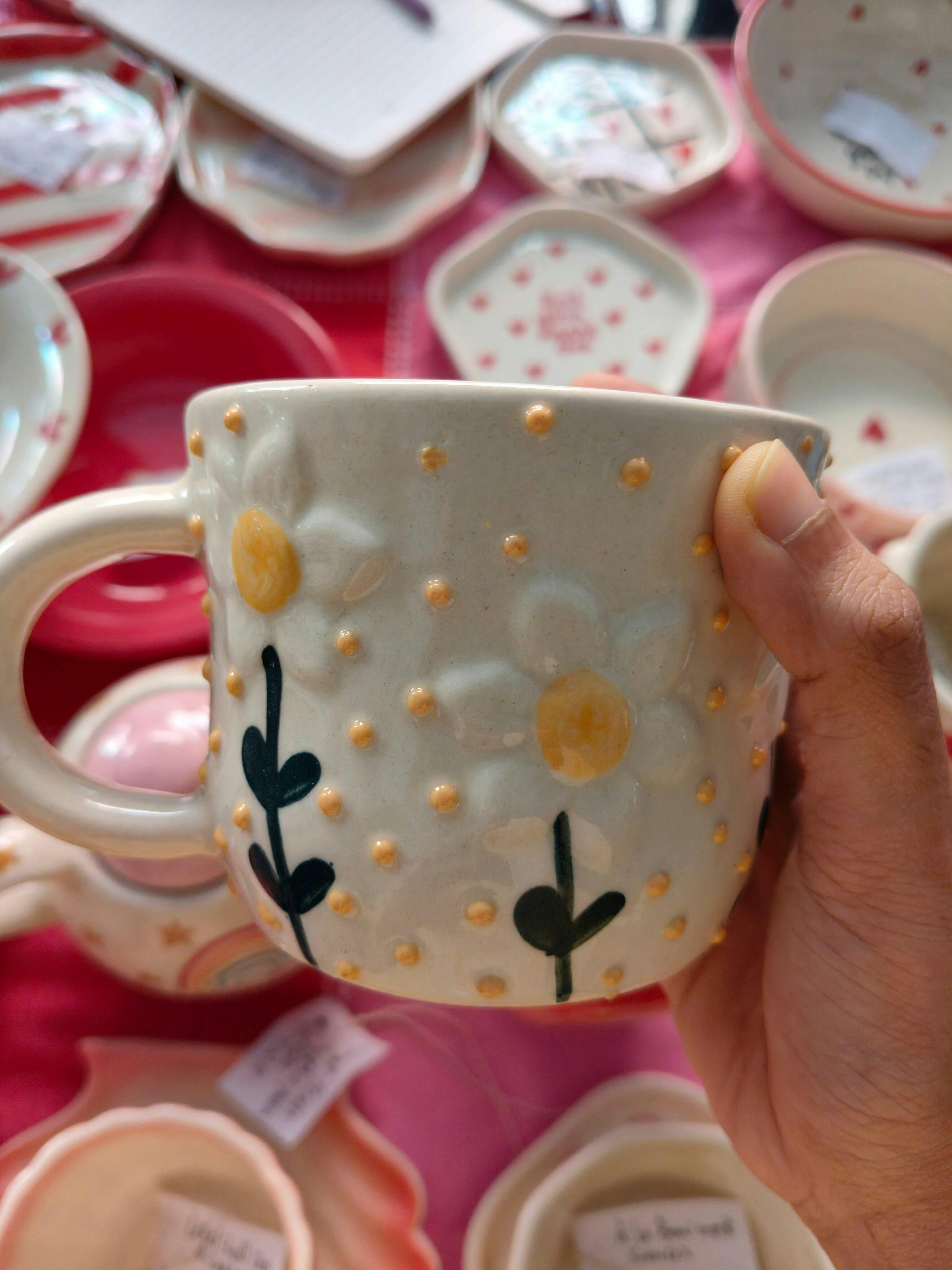 Brighten your mornings with the charm of our Golden Bloom Mug. Handcrafted with delicate floral motifs and dotted golden accents, this mug brings a touch of sunshine to every sip. Its cheerful daisies and textured design make it not just a cup, but a little garden of joy in your hands.