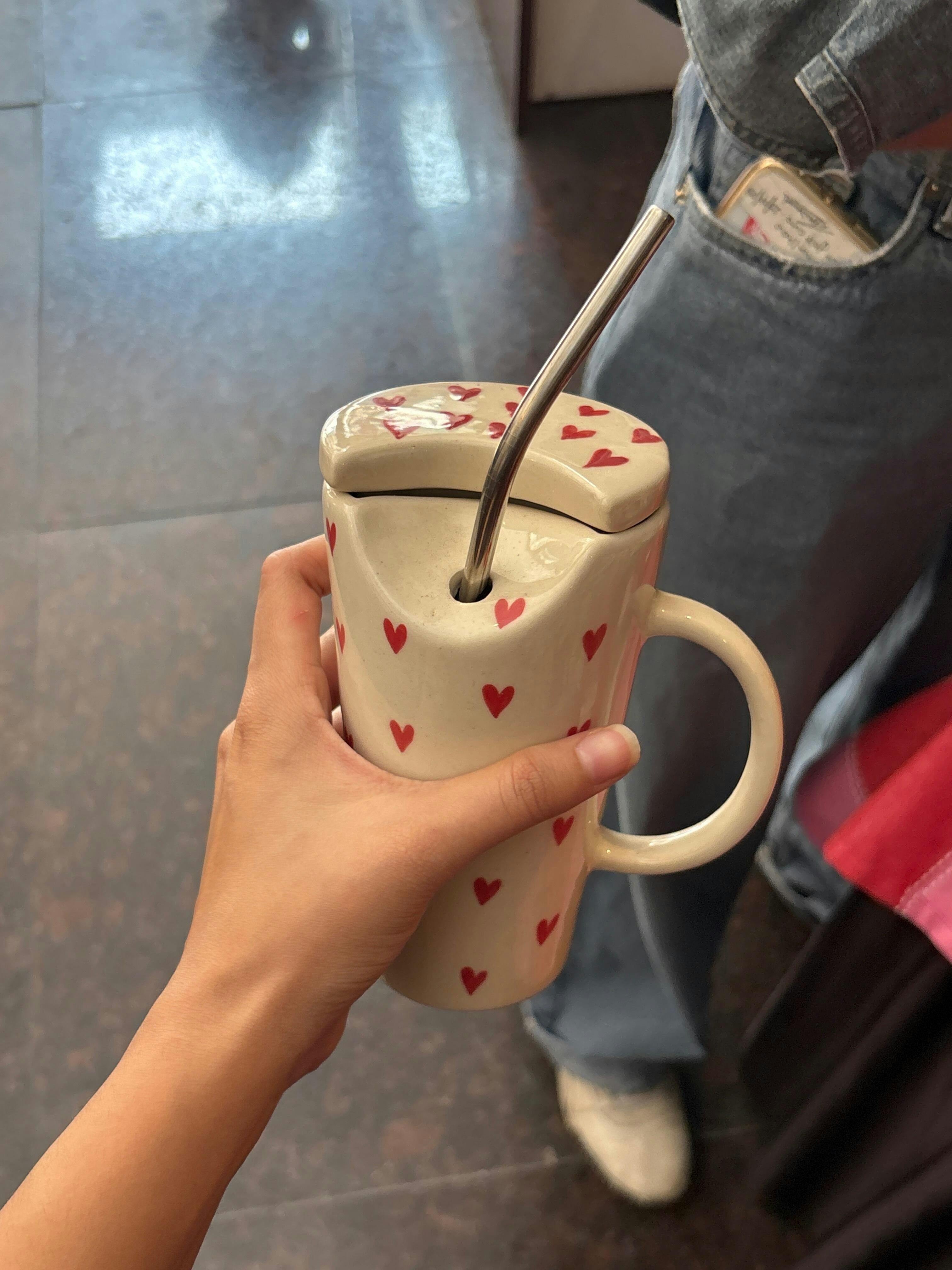 Mini Heart Sipper - Sip in style with this adorable ceramic sipper covered in tiny red hearts. Perfect for coffee, tea, or smoothies, it comes with a snug lid and metal straw making it cute, practical, and easy to carry every day.
