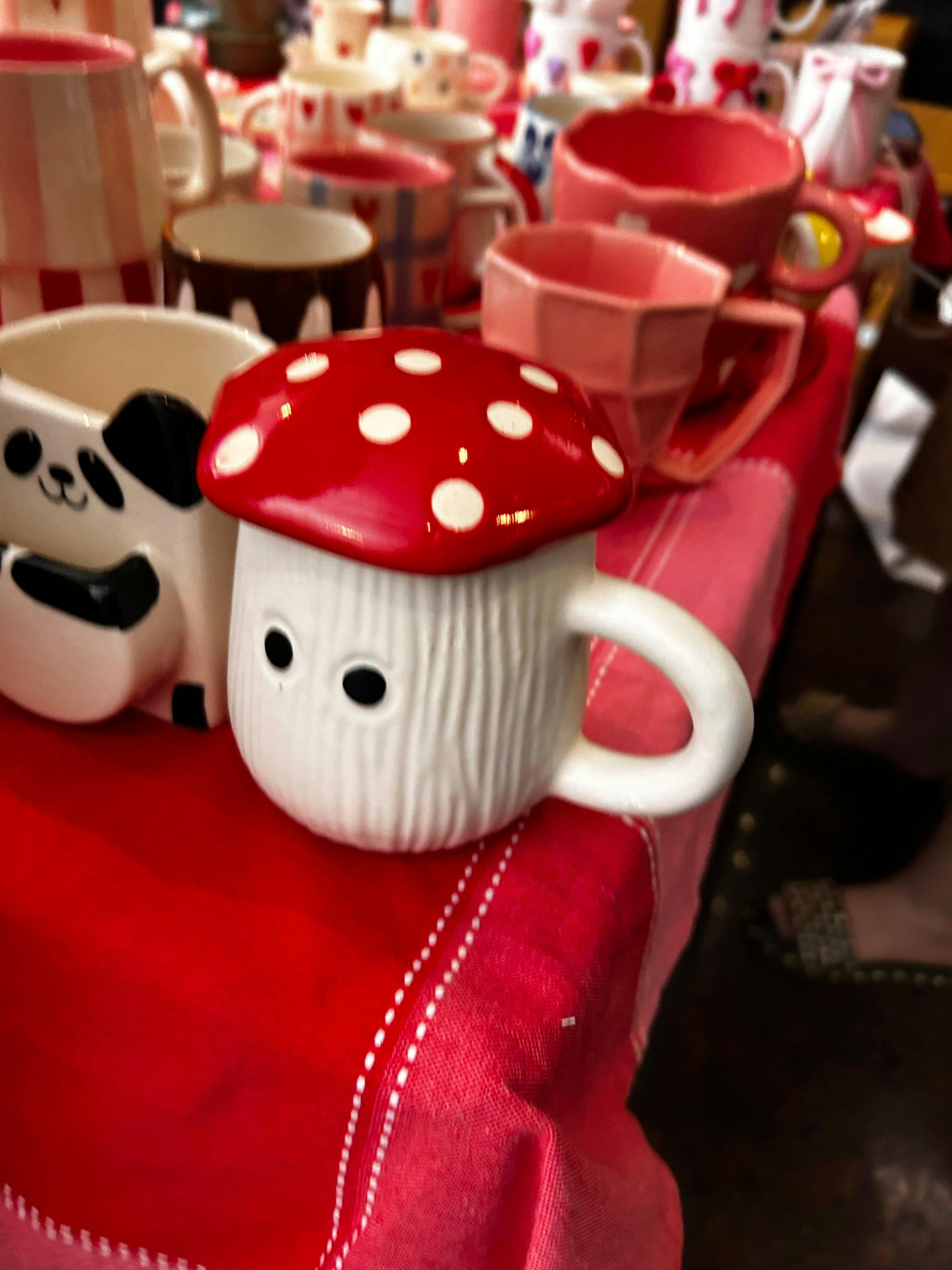 - Design: Mushroom-inspired mug with red cap lid & cute eye details