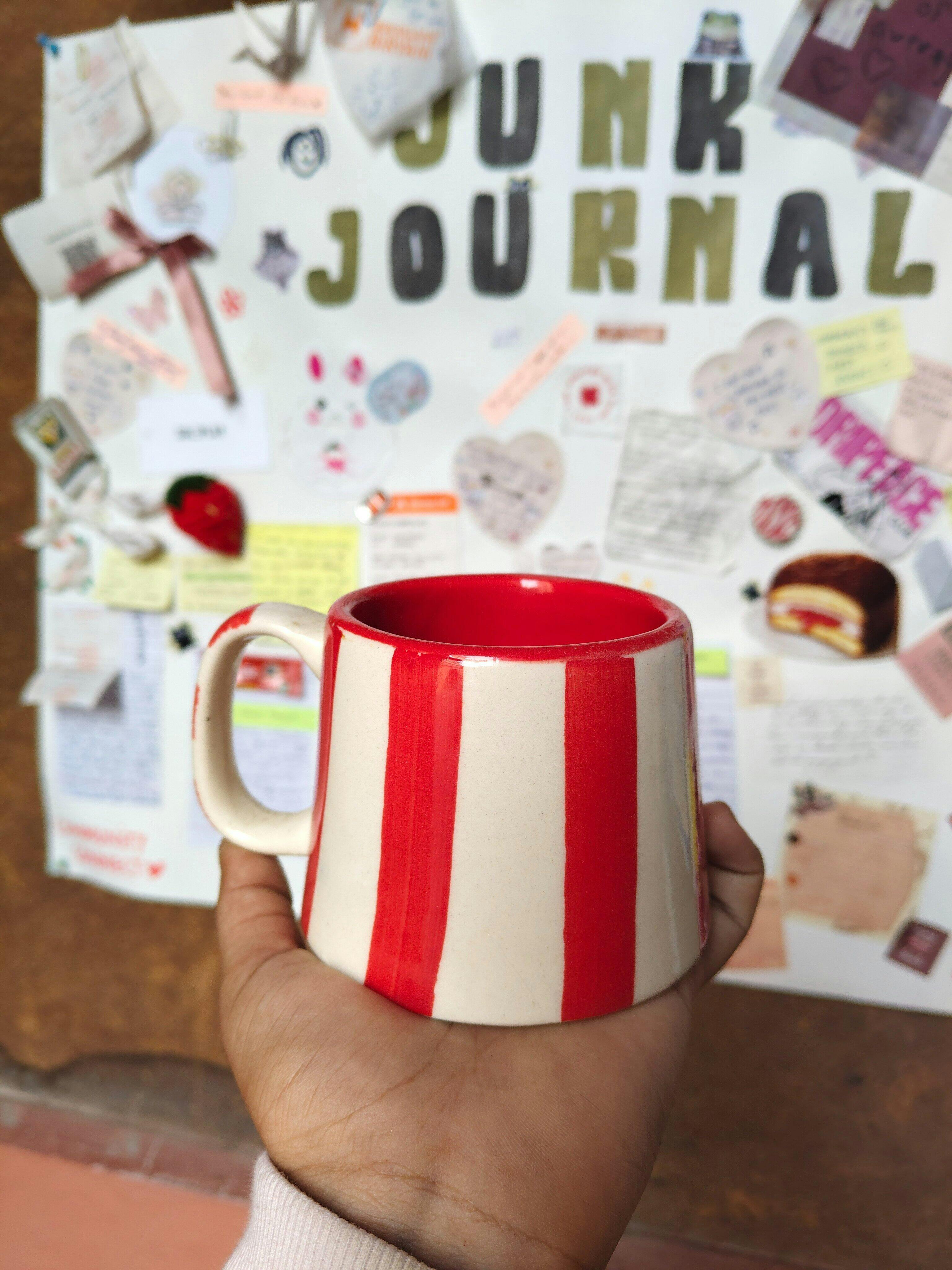 Sip in style with our Red Streak Mug, designed with soft pink hand painted streaks that bring a playful yet elegant touch to your drinkware. Red  interior paired with the striped exterior creates a chic contrast, making every coffee or tea break feel extra special.